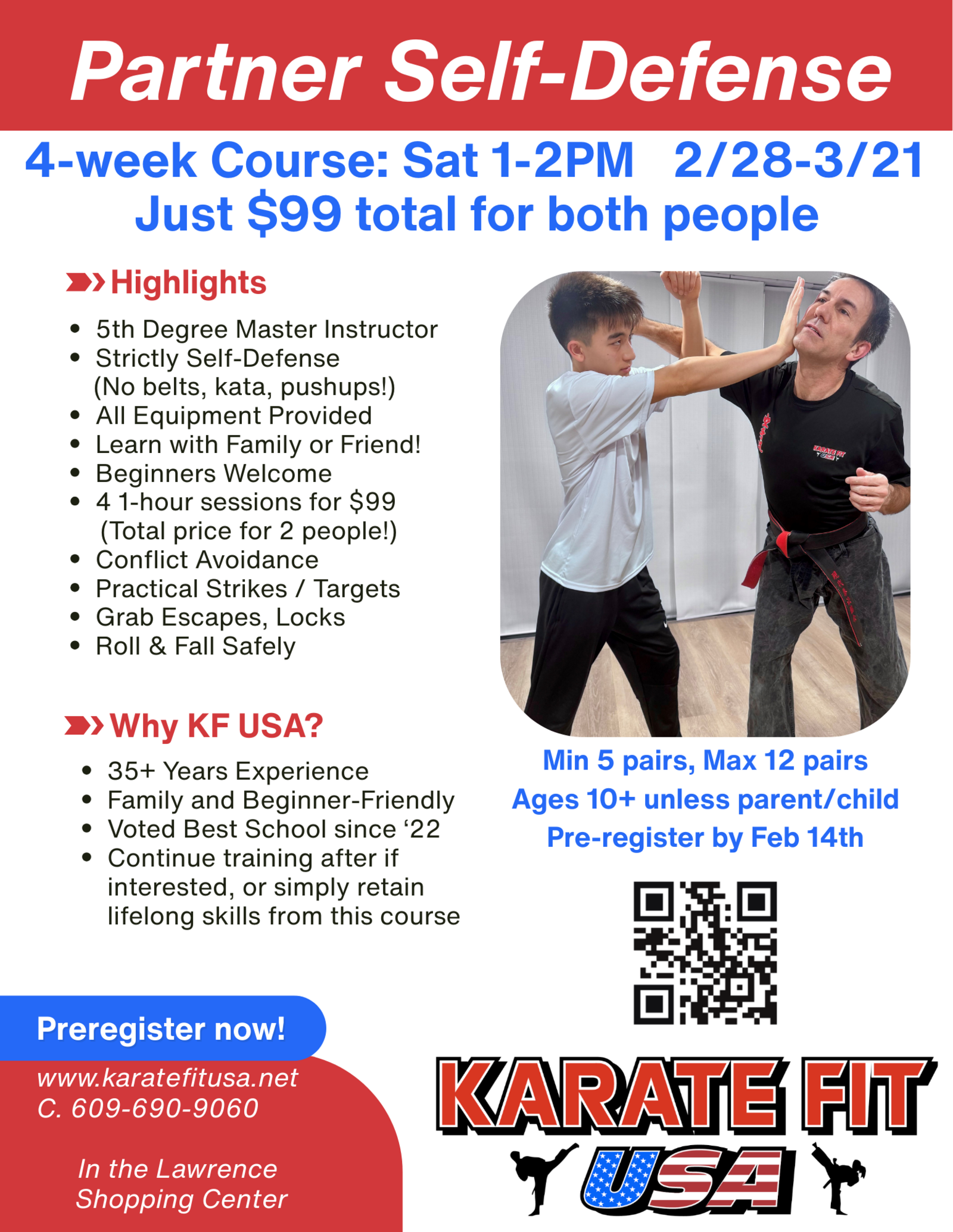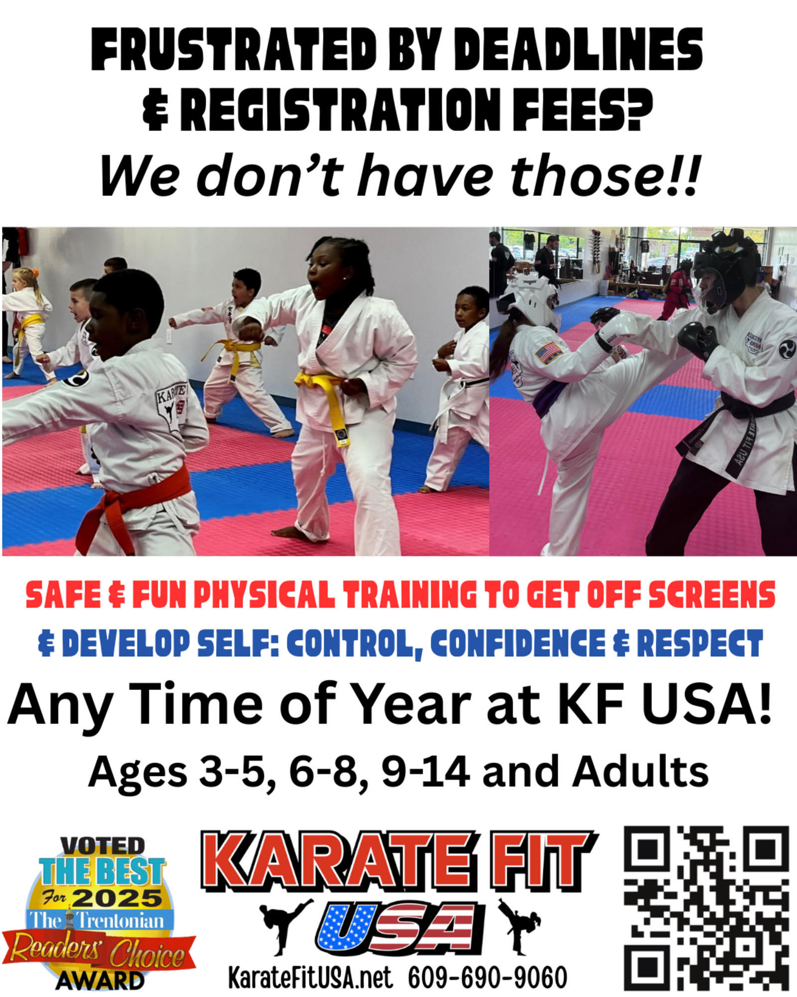 Thank you for contacting us. We will follow up with you as soon as we can to answer any questions you might have and to schedule your free trial class! You can also call or text 609-690-9060 for more info, and can pre-register for your trial class at www.karatefitusa.net/signup